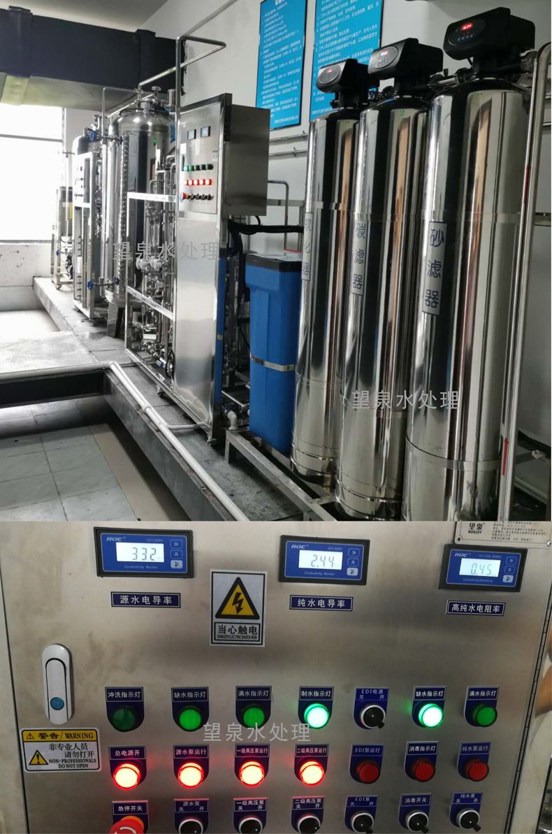 1)前三級罐體,第一級石英砂過濾器,第二級活性炭過濾器,第三級軟化過濾器,第四級精密過濾器,第五級是RO膜,EDI