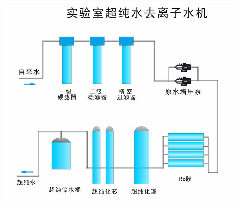 源水泵      砂濾器       碳濾器     軟水器    精濾保安濾器      RO反滲透主機 EDI      純水塔    (紫外線殺菌器      各個管線飲水機)