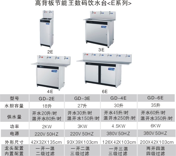 產品名稱:高背板節能王數碼飲水臺產品型號:GD-2E GD-3E GD-4E GD-6E GD-6C外形尺寸: