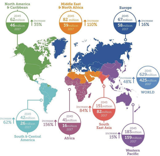 2017年國(guó)際糖尿病聯(lián)合會(huì)出版的IDF糖尿病地圖集第8版估計(jì),中國(guó)的糖尿病患者人數(shù)為1.14億,相當(dāng)于全世界超過1/4的糖尿病患者(全球共4.25億)來自中國(guó)。