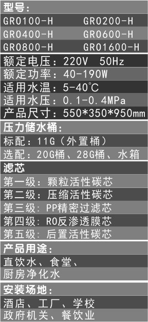 產品名稱:RO商務凈水機H黑白系列產品型號:GRO400-H外形尺寸:550*350*950mm