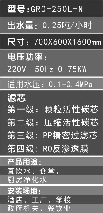 6. 本產品適合單位、工廠、食堂、食品、飲料、酒廠、醫藥、電子、化工、實驗室、中空 設備、汽配制造、行業用水、地下水質凈化、清洗玻璃、清洗墨盒及微型電子工業設備純凈用水,家庭及學校直飲水。還可以廣泛連接在開水器、咖啡機、制冰機等終端用水設備前面,解決其用水凈化問題。