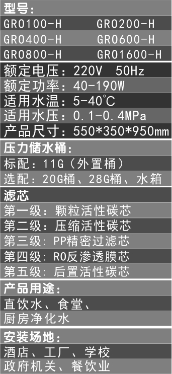 產(chǎn)品名稱:豪華商務(wù)純水機(jī)RO200-H產(chǎn)品型號(hào):GRO100-1600G-H外形尺寸:550*350*950(mm)